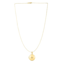 This beautiful 14k yellow gold Round North Star Locket necklace sits close to the heart. It comes in a high polish finish & closes with a lobster clasp. This stunning piece is hand crafted & sits effortlessly between a glimmering rolo chain. A small diamond perfectly placed gives you that little extra sparkle. Measuring 18 inches in length.