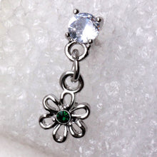 This 316L Stainless Steel Cartilage Earring with a Flower Dangle features a 6.5 x 6.5mm flower design with an Emerald Green Cubic Zirconia embedded in the center, as well as 4mm prong set CZs on the top barbell. The bar thickness is 16GA (1.2mm) and measures 1/4" (6mm) in length, while the ball size is 3mm. Externally threaded, this cartilage earring is crafted with 316L stainless steel and zinc alloy, as well as cubic zirconia.
