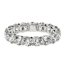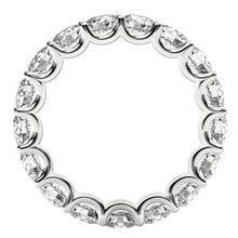 Intriguing curved prongs of glimmering 14k white gold encircle beautiful round cut lab grown diamonds with elegant, arch-like waves of shine in this spectacular eternity ring, adding contrast and organic shape to a traditional setting. This ring belongs to the Eternity Us collection.